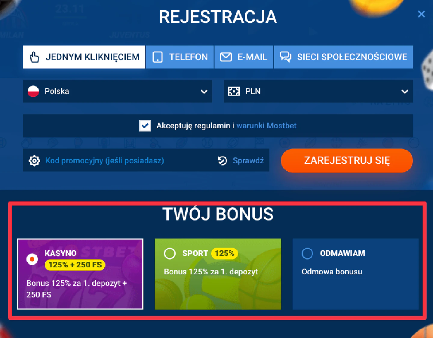 - Wybierz Sposób Rejestracji: Zdecyduj się na jedną z dostępnych metod (Jedno kliknięcie, Telefon, E-mail, Sieci społecznościowe).